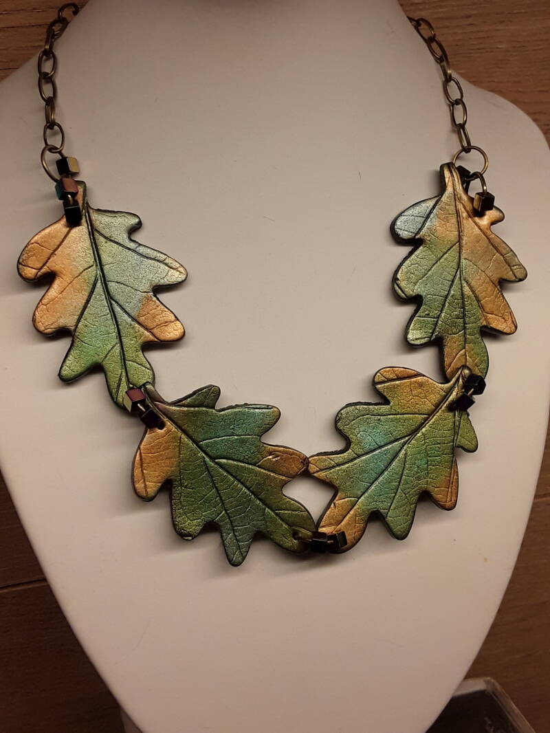 Bloemenkralen van polymeerklei gemaakt aan mijn keukentafel gecombineerd met howlitkralen en glasblokjes.